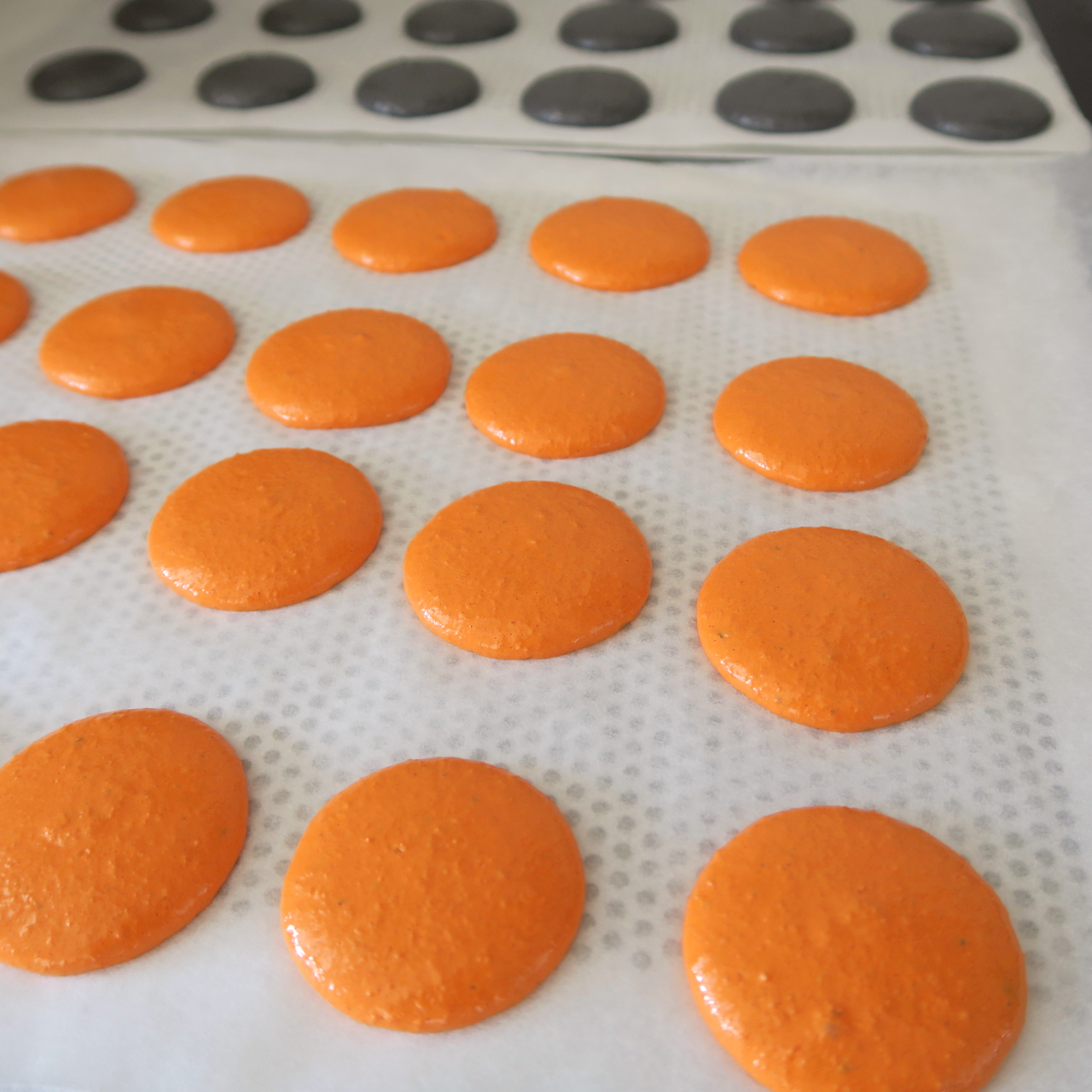 - Pour ma part, j’ai utilisé la ganache non colorée pour les macarons oranges, et la ganache orange pour les macarons noirs.